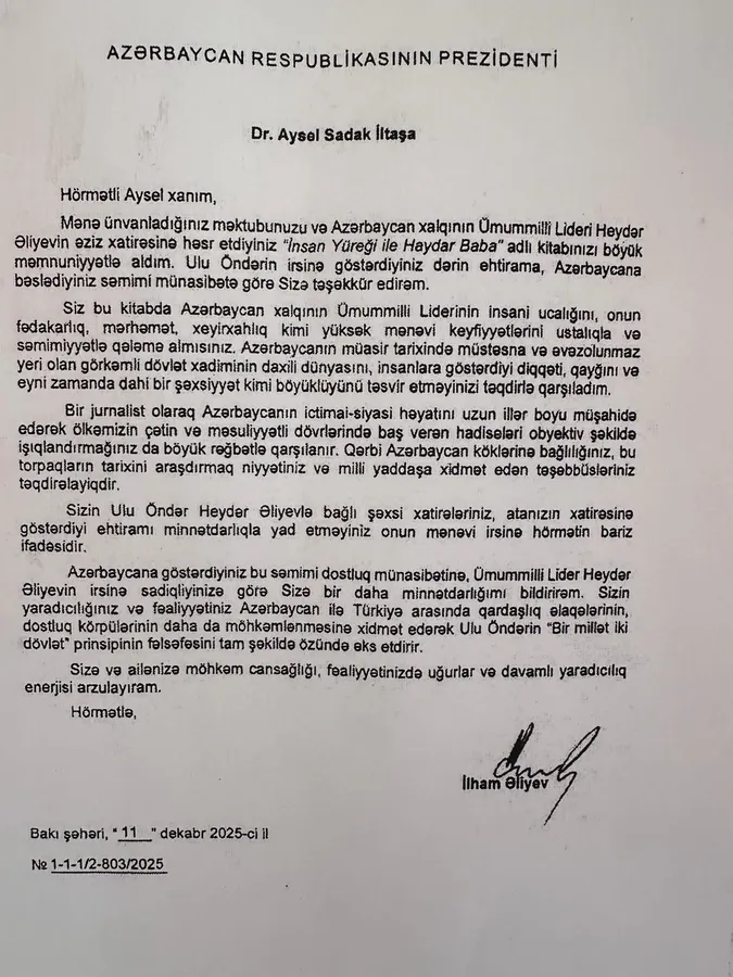 Azerbaycan Cumhuriyeti Cumhurbaşkanı İlham Aliyev ,“İnsan Yüreği – Haydar Baba” kitabını okuduktan sonra eseri hazırlayan yazar Prof. Dr. Aysel Sadak İltaş’ imzasıyla şahsî diplomatik teşekkür mektubu göndererek onurlandırdı.