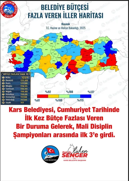 Bu kapsamda Kars, Kilis ve Denizli ile birlikte Türkiye’nin mali açıdan en güçlü belediyeleri arasında yer aldı. Hazırlanan “Belediye Bütçesi Fazla Veren İller Haritası”nda Kars, koyu mavi renkle gösterilen mali disiplin şampiyonları arasında bulunuyor.