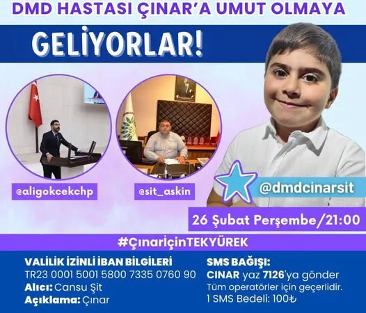 Duchenne Musküler Distrofi (DMD) kas hastalığıyla mücadele eden 7 yaşındaki birinci sınıf öğrencisi Çınar Şit, sağlığına kavuşup hayalindeki pilotluk mesleğini yapabilmek için yardımseverlerin desteğini bekliyor. 14 aylıkken DMD tanısı konulan ve 4 yaşından bu yana hastalığın etkilerini hisseden Çınar için ailesi tarafından başlatılan Valilik onaylı yardım kampanyası 18. ayına girerken, hedeflenen miktarın büyük bir kısmı toplandı ancak zaman daralıyor. Ailesi, Çınar'ın yürüyebilme yetisini kaybetmemesi için tedavisine en kısa sürede başlaması gerektiğini vurguluyor.