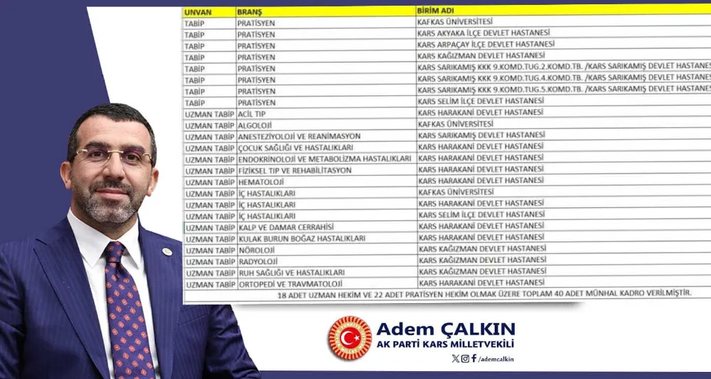 Milletvekili Çalkın, açıklamasının sonunda 126. Dönem DHY Kurası ile Kars’a atanan tüm hekimlere görevlerinde başarılar dileyerek, atamaların şehir için hayırlı olmasını temenni etti.
