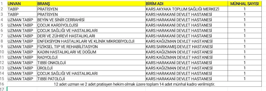 12 adet uzman, 2 adet pratisyen hekim atanmıştır. Gazi Kars'ımız için sağlığa ve hayra vesile olması duasıyla...