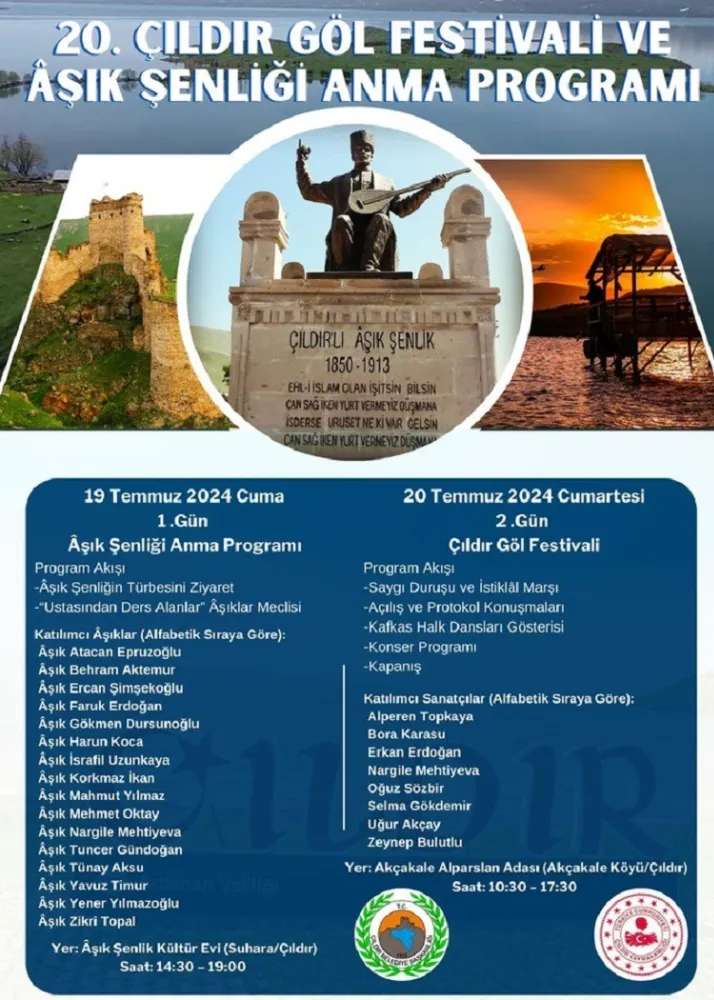 Çıldır Belediyesi tarafından organize edilen ve bu yıl 20’ncisi düzenlenecek olan Çıldır Göl Festivali ve Âşık Şenliği Anma Programı da belli oldu. 20. Çıldır Göl Festivali ve Âşık Şenliği Anma Programı 1. gün Âşık Şenlik’te, 2. gün ise Akçakale Alparslan Adasında gerçekleştirilecek.