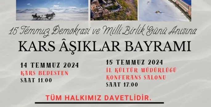 Âşıklar Bayramı’nda, Kars’ın önemli ozanları ve şairleri bir araya gelerek, 15 Temmuz'un anlam ve önemini anlatan eserlerini seslendirecekler. Birinci gün (14 Temmuz) şiir dinletileri, âşık atışmaları ve çeşitli kültürel etkinliklerin yer alacağı programda, ikinci gün (15 Temmuz) İl Kültür Müdürlüğü Konferans Salonunda ödül töreni gerçekleştirilecektir.