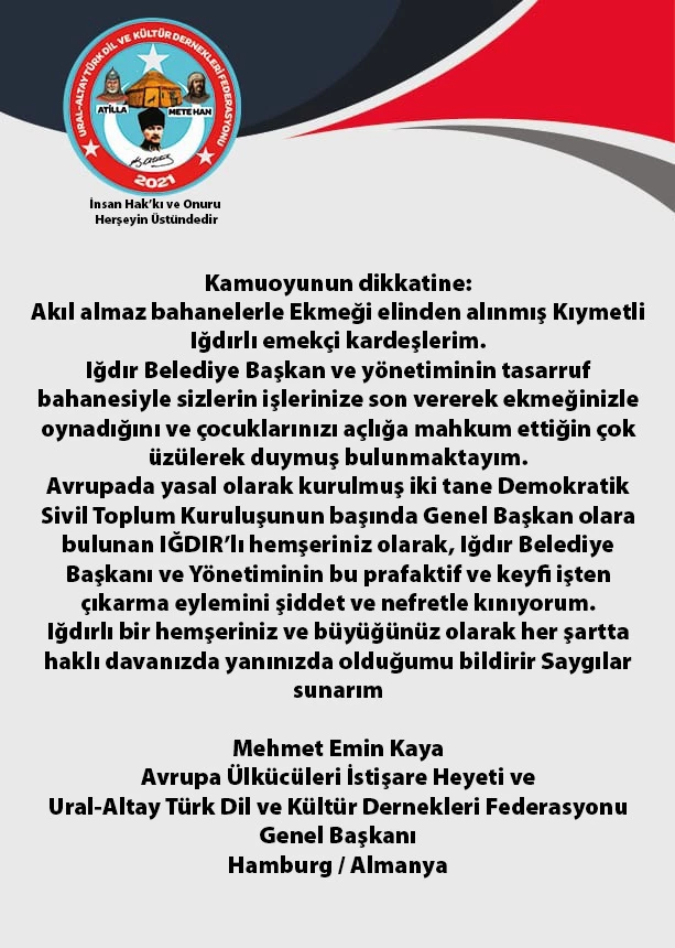 Avrupada yasal olarak kurulmuş iki tane Demokratik Sivil Toplum Kuruluşunun başında Genel Başkan olara bulunan IĞDIR’lı hemşeriniz olarak, Iğdır Belediye Başkanı ve Yönetiminin bu prafaktif ve keyfi işten çıkarma eylemini şiddet ve nefretle kınıyorum.